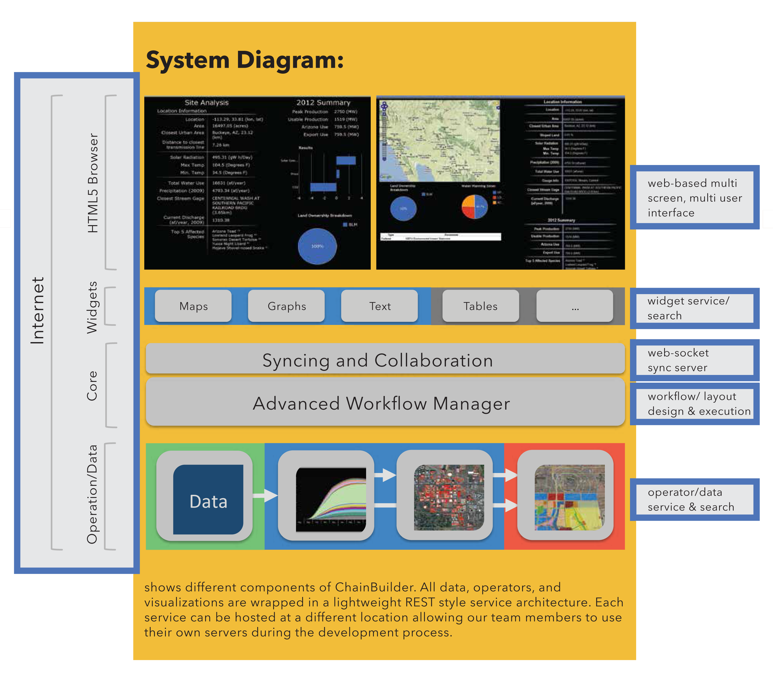 ChainBuilder is an easy to use integration platform designed to provide users with the ability to collaboratively link data, analytics, and visualizations to generate dashboard based decision making tools that can deliver content directly to decision makers. It supports collaborative decision-making by enabling the use of multi-screen environments and distributed synchronization of content and interactions on the dashboards. The software is open source and can be freely used by all partners.