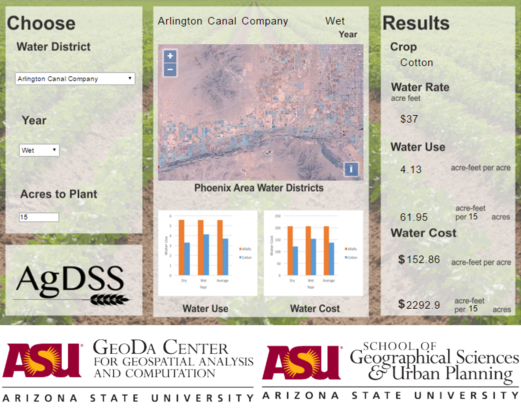 Challenge: Integrate Evapotranspiration data with local water costs to develop a decision support system for Arizona farmers and water resource managers. Users will be able to determine which agricultural crops use the least amount of water and cost the least in each water district in Maricopa County Arizona.